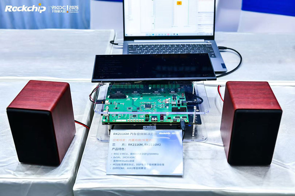 会上发布了最新一代DSP-RK2116M,其在RK2118M基础上进行了架构和IP上的精简,同时新增4TX4RX的Audio Codec,并且软件高度兼容RK2118M,可无缝移植。